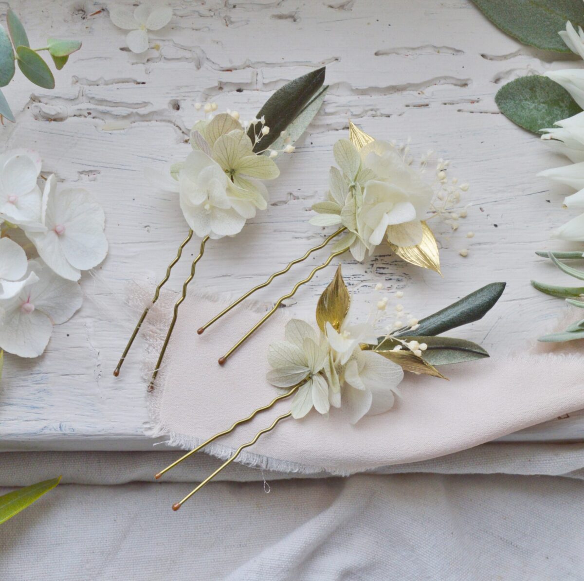 3 épingles à chignon fleurs éternelles vert sauge, blanc, or et feuilles d’olivier.