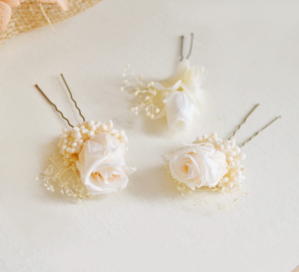 3 épingles à chignon roses éternelles nude, ivoire et blanches – coiffure mariée roses stabilisées.