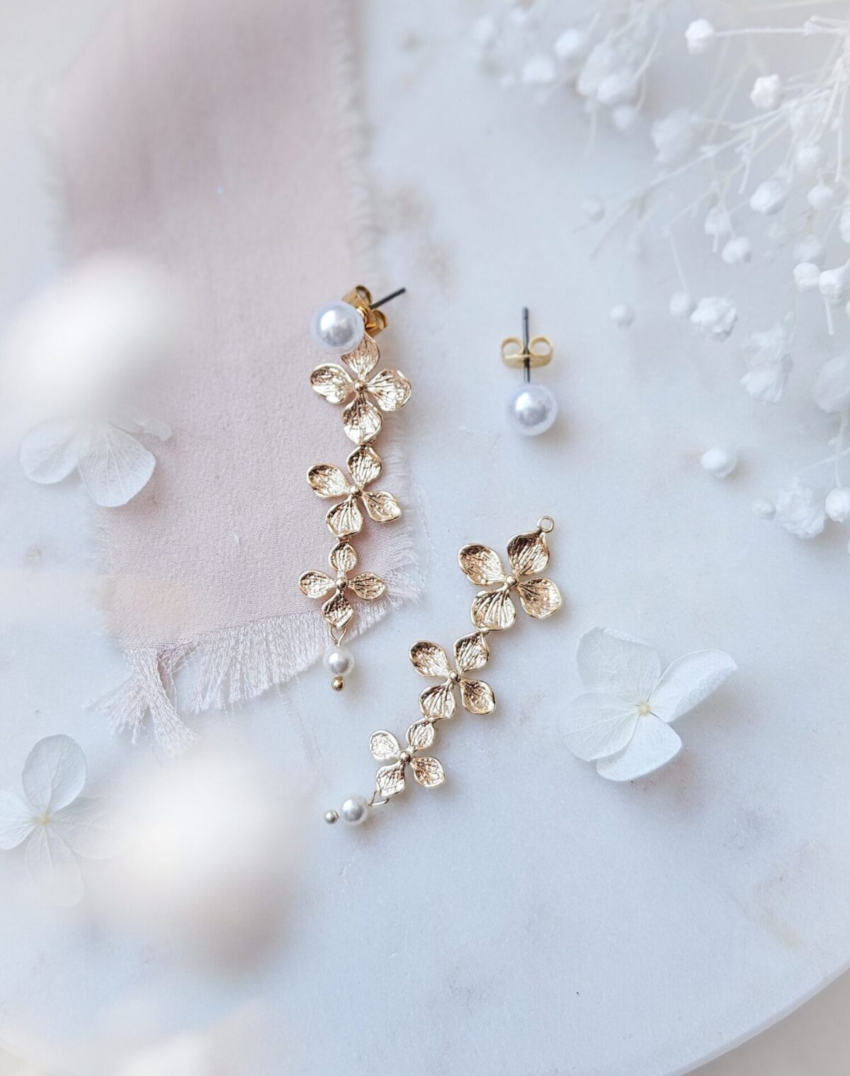 Boucles d’oreilles amovibles perles blanches et triple fleurs dorées
