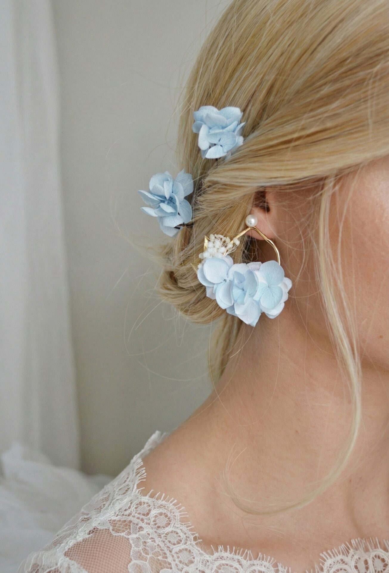 Chaque boucle se compose d’une boucle en perle d’eau douce et de fleurs stabilisées éternelles.
