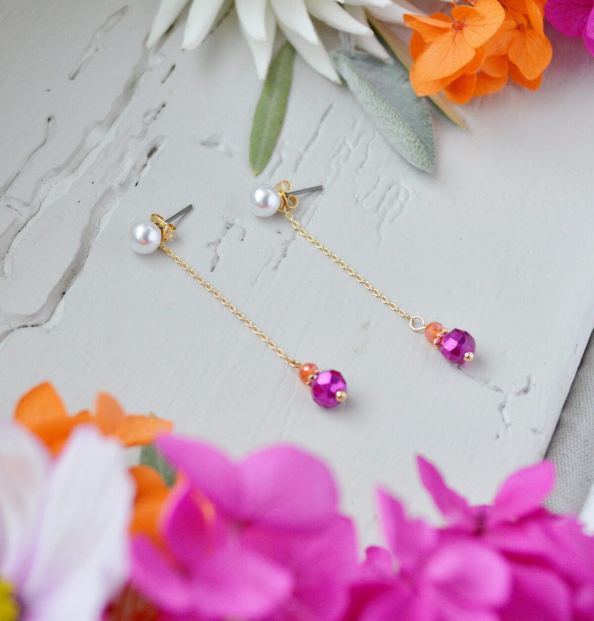 Chaque boucle se compose d’une puce en titane ornée d’une perle, d’un pendant avec une chaine, de perles facettées orange et fuchsia et de perles Pure crystal nacrées.