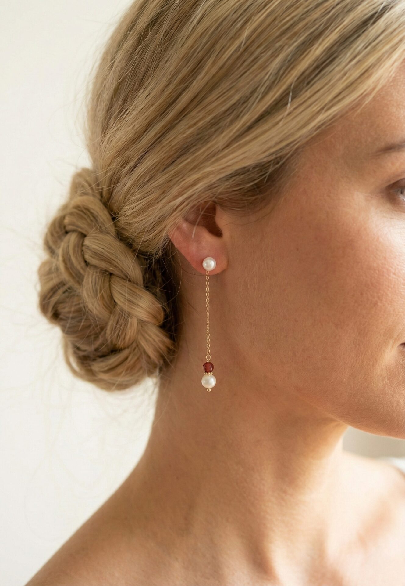 Boucles d’oreilles pendantes amovibles avec chaine et perles terracotta – bijoux mariage chics couleurs terracotta.