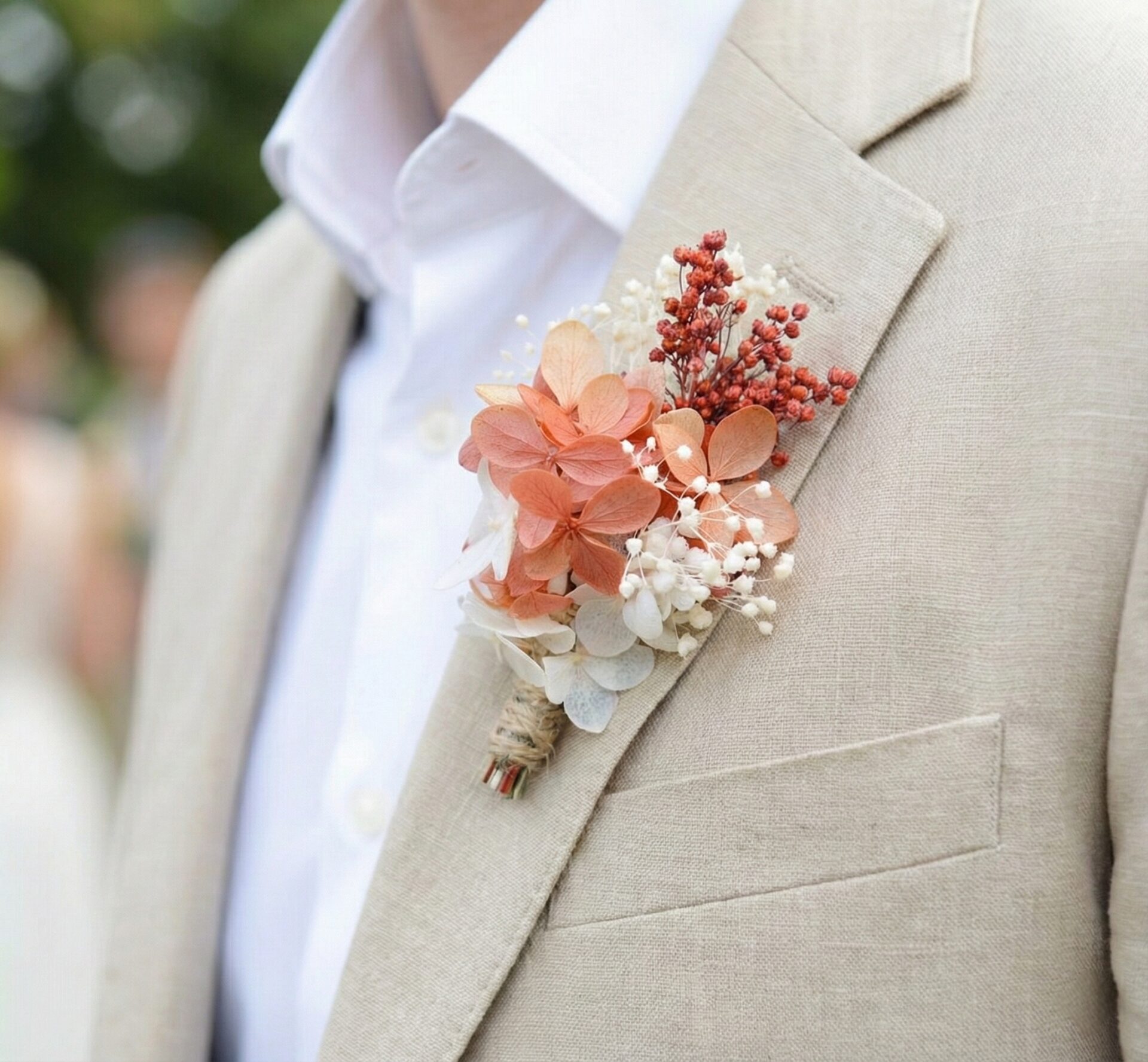 Boutonnière mariage fleur stabilisées terracotta et ivoire blanc