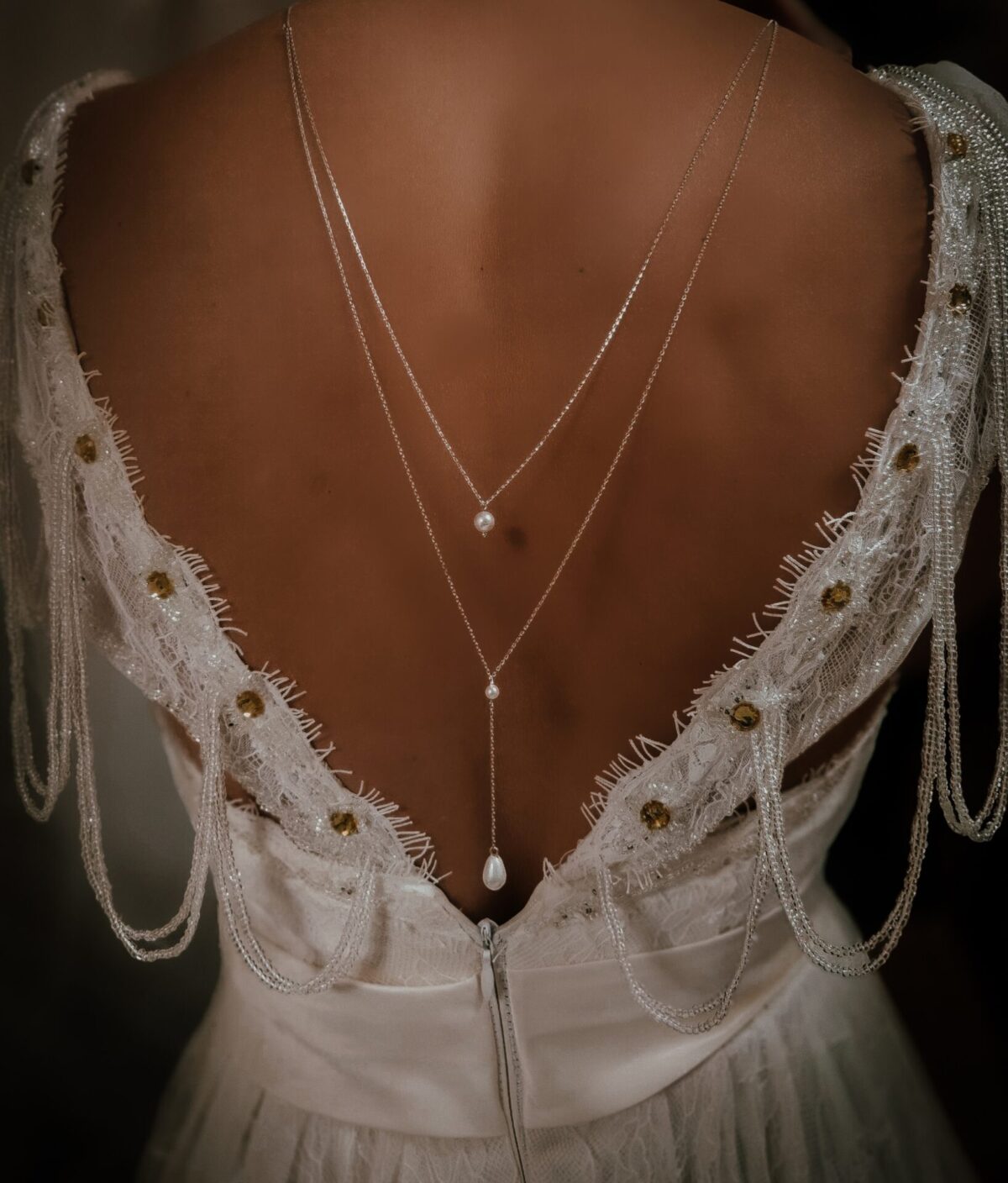 Collier de dos doubles chaines perles blanches nacrées et pendant perle goutte – bijoux de dos mariage