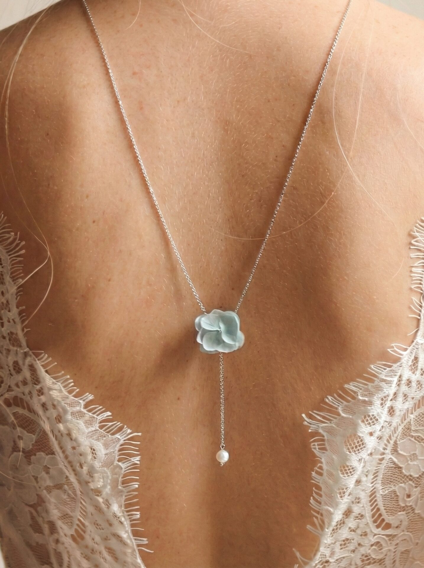 Ce bijou de dos se compose d’un collier fin, de fleurs d’hortensia colorées séchées et de perles nacrées blanc naturel.
