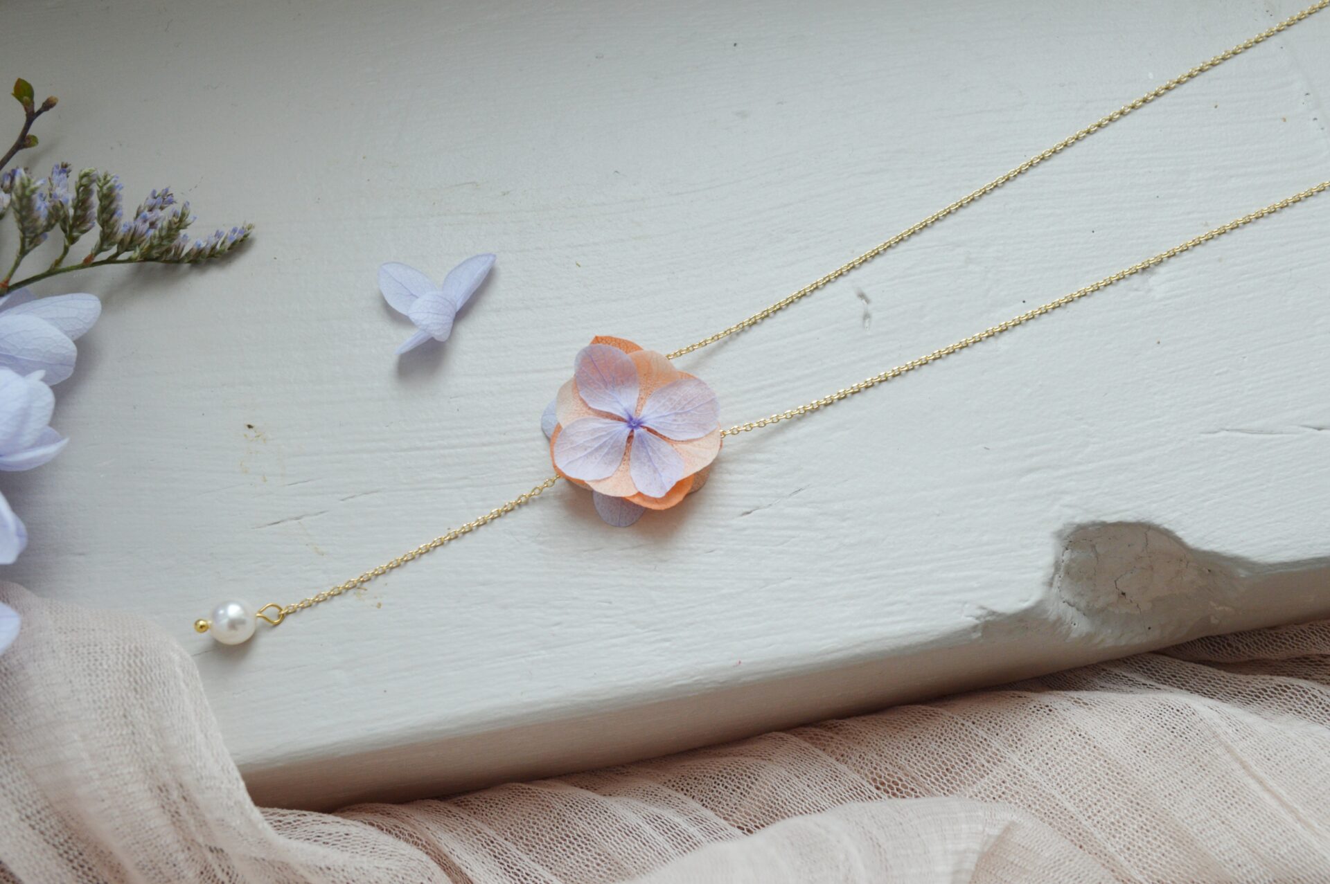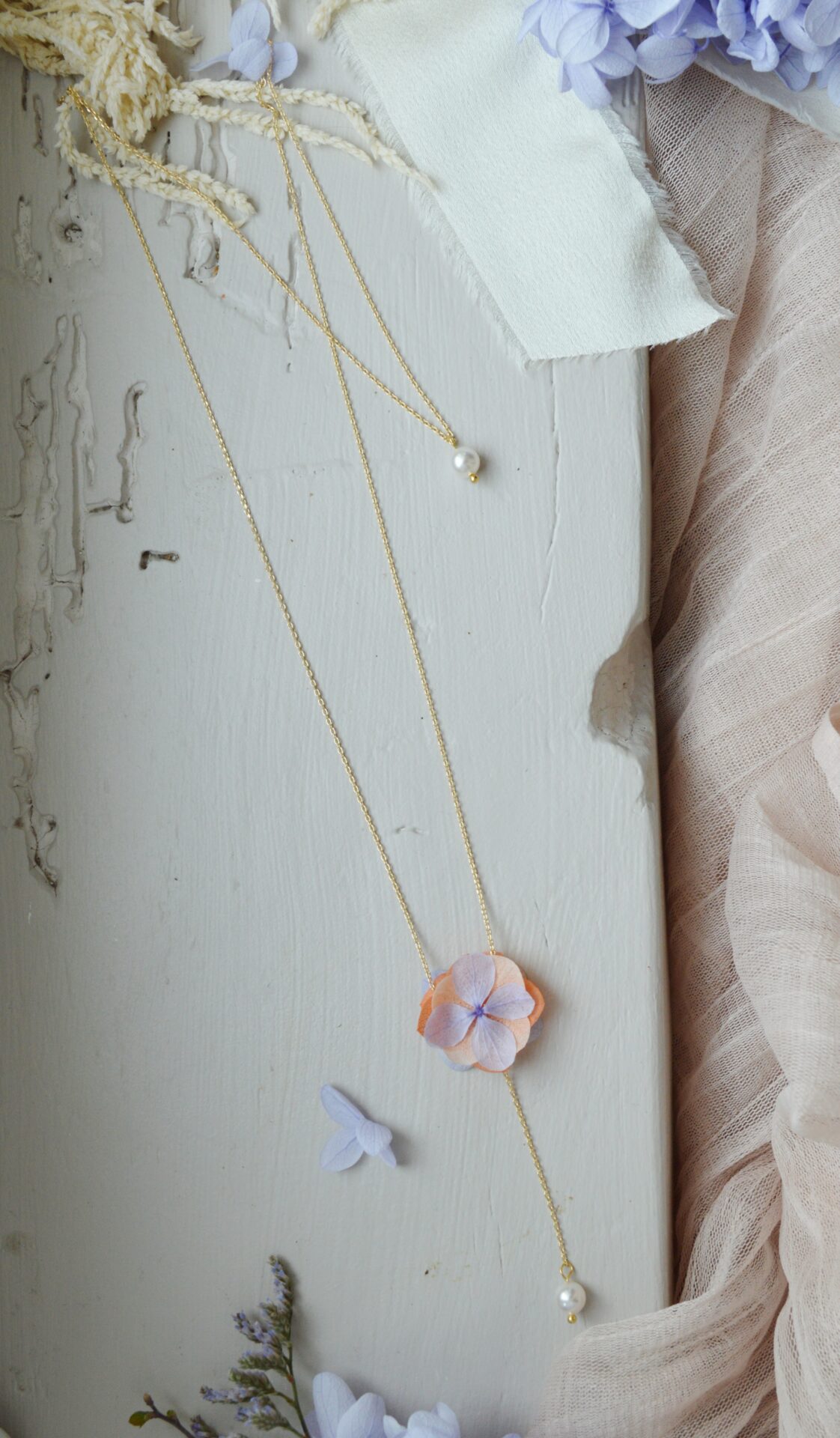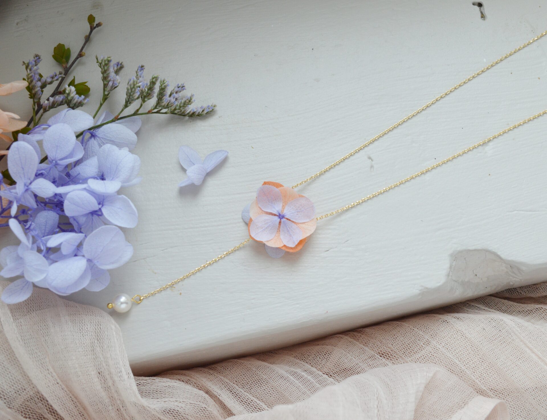 Ce bijou de dos se compose d’un collier fin, de fleurs d’hortensia colorées séchées et de perles nacrées blanc naturel.
