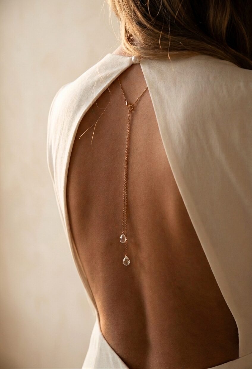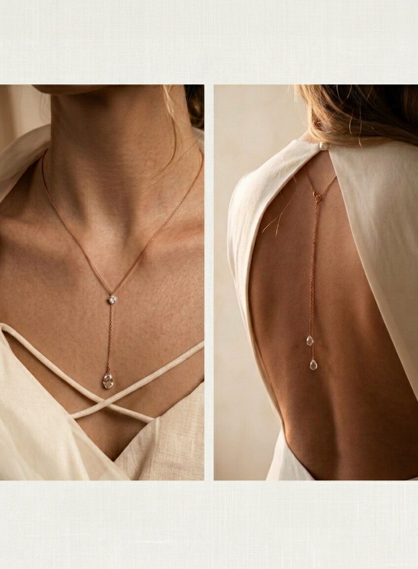 Collier de dos mariage strass et pendant cristaux sur le devant; 2 cristaux gouttes dans le dos – Simone
