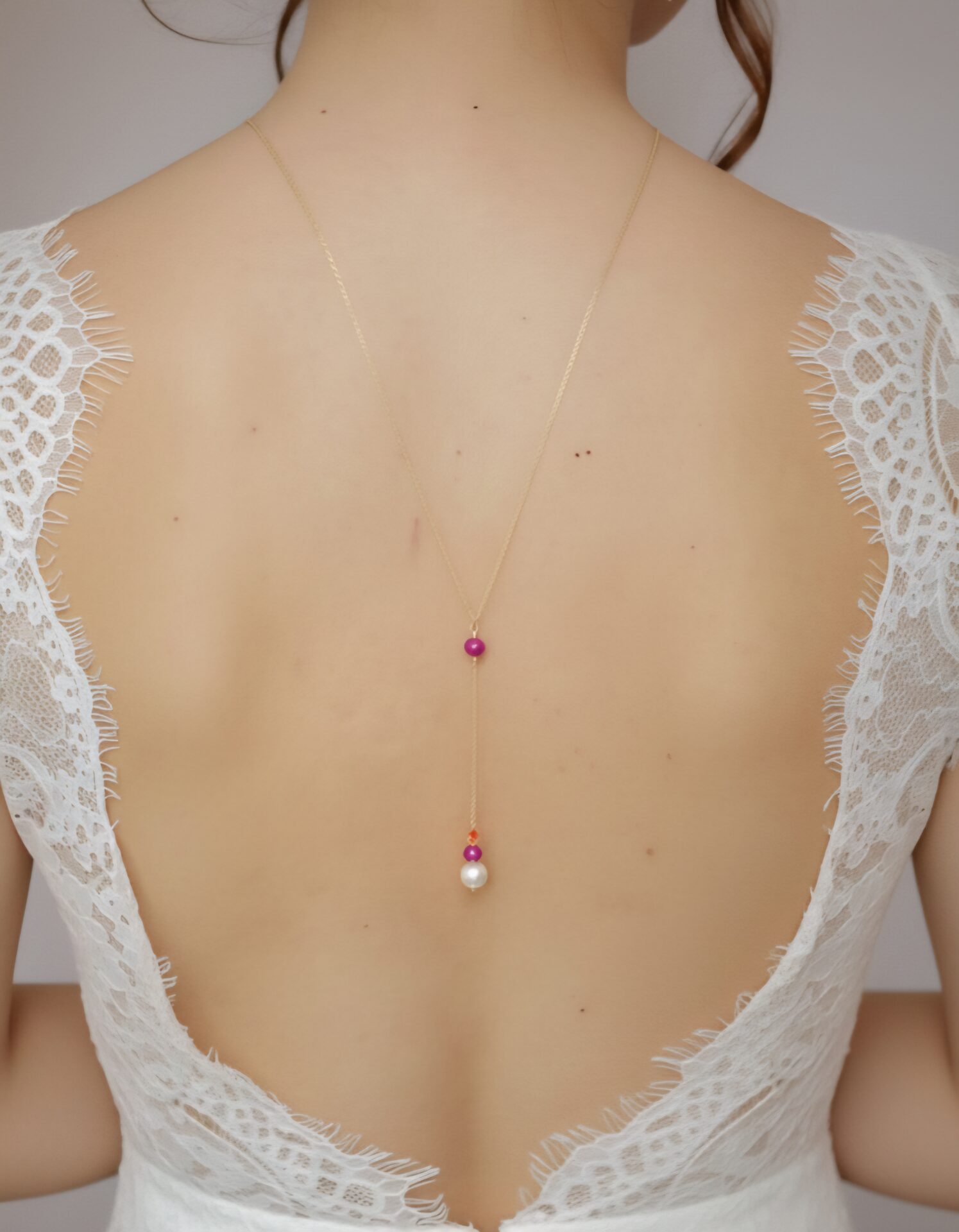 Ce bijou de dos se compose d’un collier fin en laiton doré à l’or fin, de perles facettées et de perles nacrées Pure crystal.