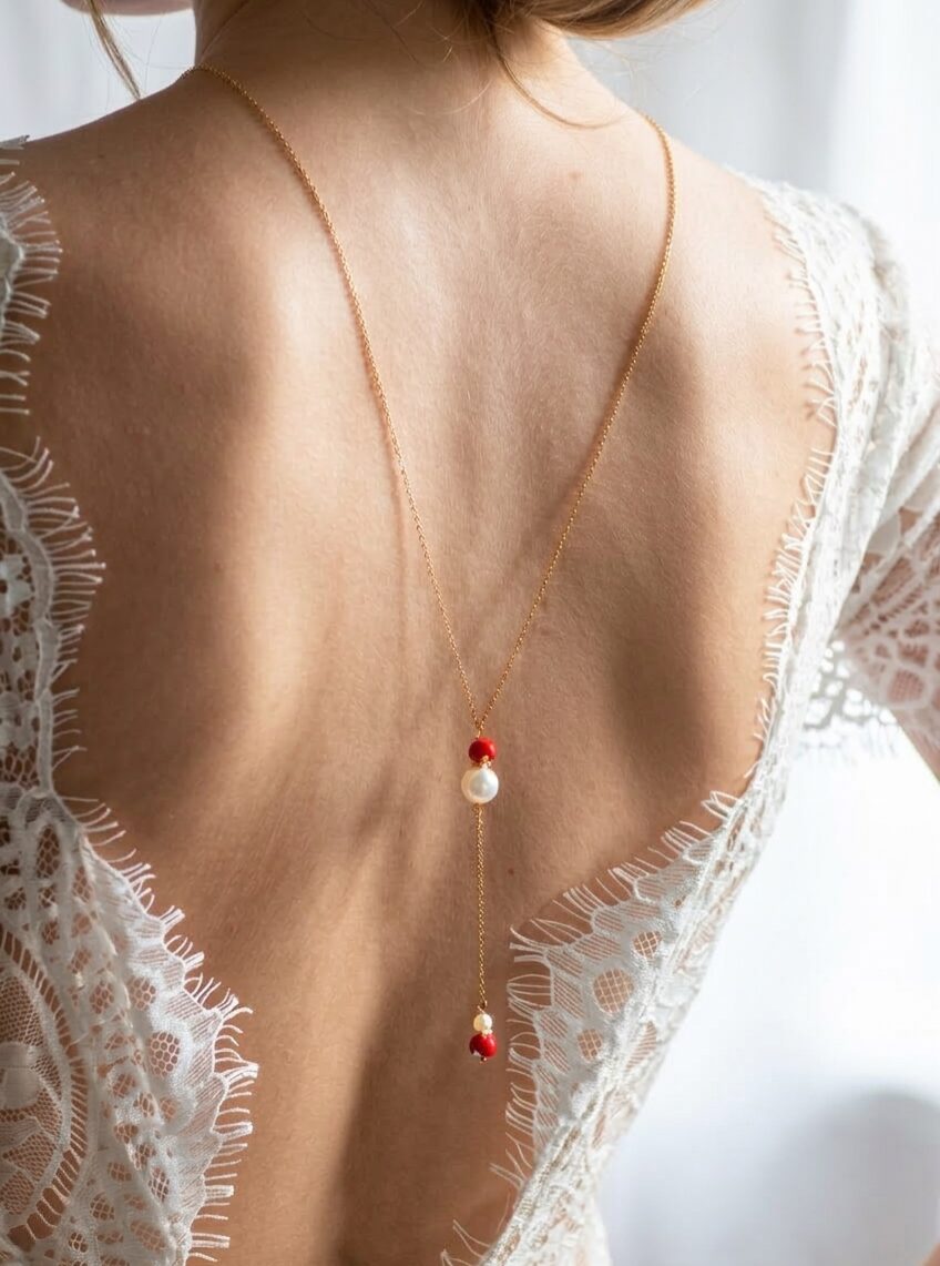Collier de dos perles nacrées et perles rouge – bijou de dos mariage chic rouge cerise