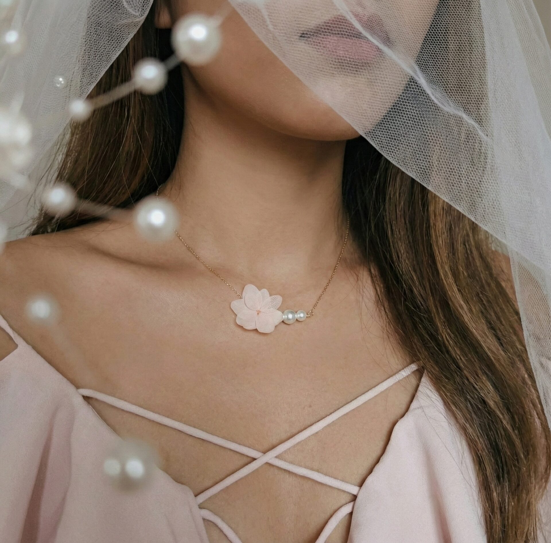 Collier petite fleur naturelle stabilisée à 3 perles – Bijou original mariage fin.