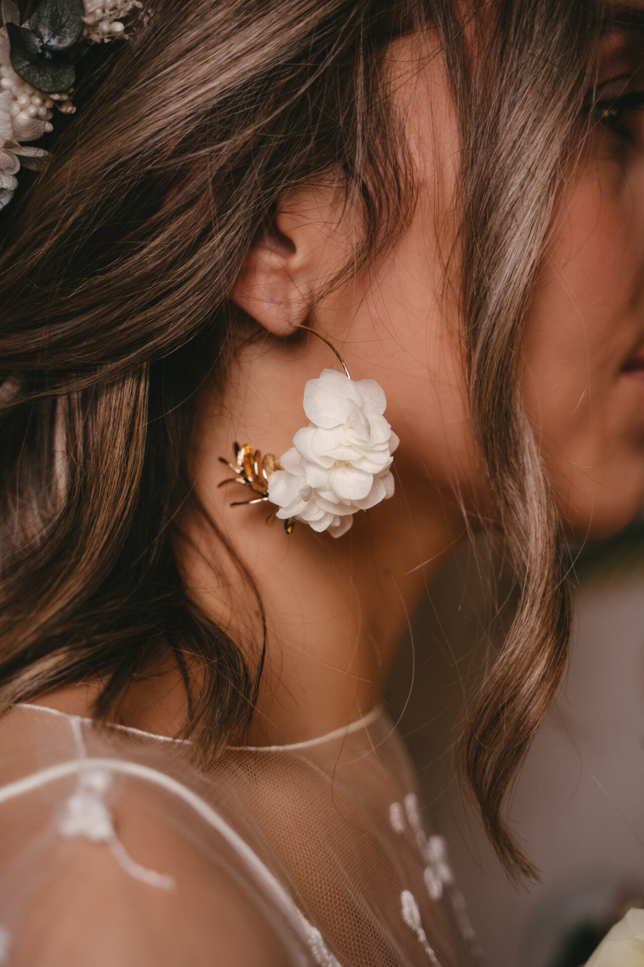 Cette créole en laiton doré à l’or fin est ornée de fleurs d’hortensias stabilisées.