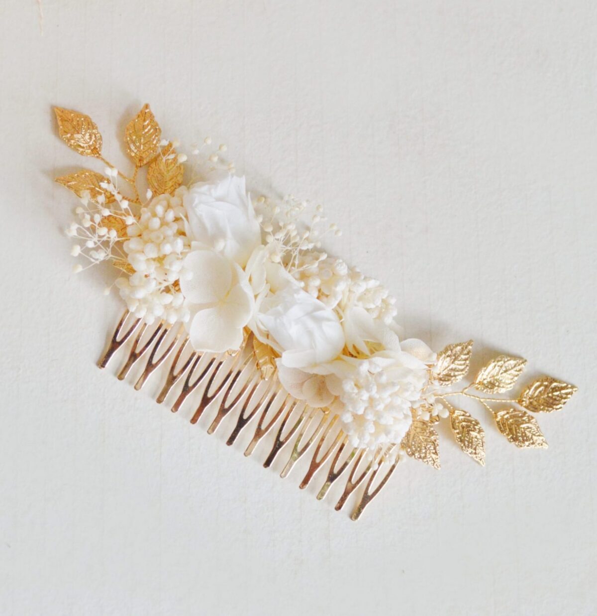 Grand peigne à cheveux fleurs fraîches éternelles blanc ivoire sur feuilles dorées et roses éternelles