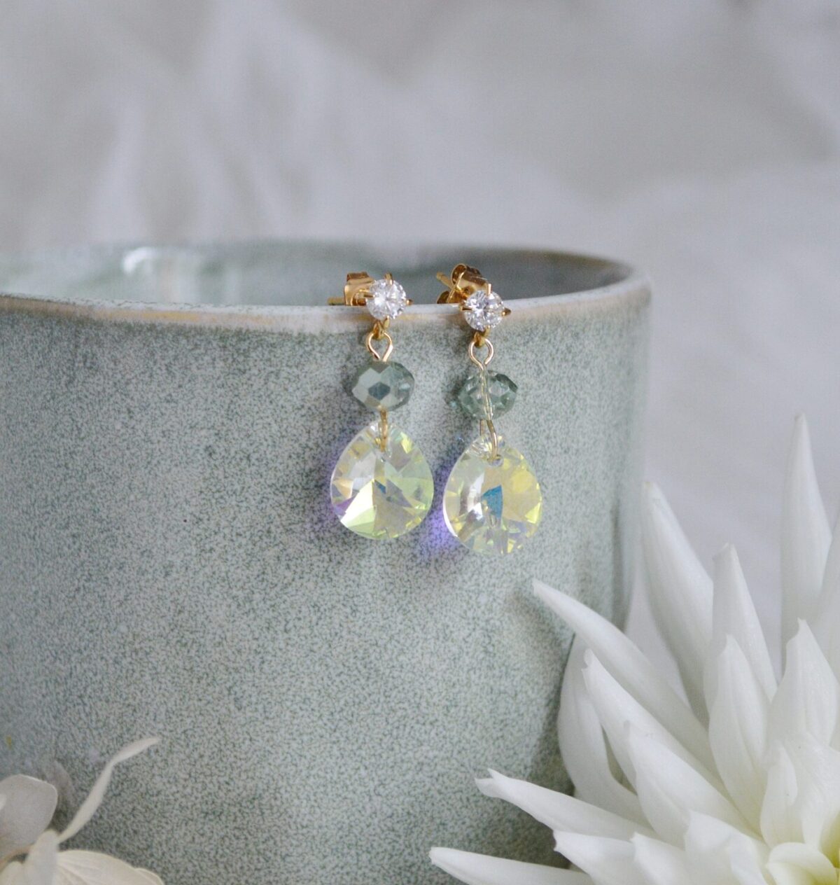 Petites boucles d’oreilles mariage cristal et perles facettées vert sauge – bijoux mariage verts